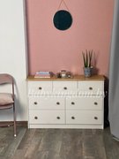 Белый матовый комод декорирован вставками в цвете светлого дуба.