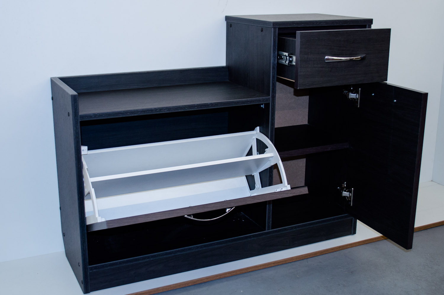 Выполненная в цвете венге обувница «Марта-М» характеризуется отличной функциональностью. В состав модели входит отделение для хранения обуви, выдвижная шуфляда для аксессуаров, а также шкафчик с двумя полками. Фурнитура представлена в виде массивных хромированных ручек.