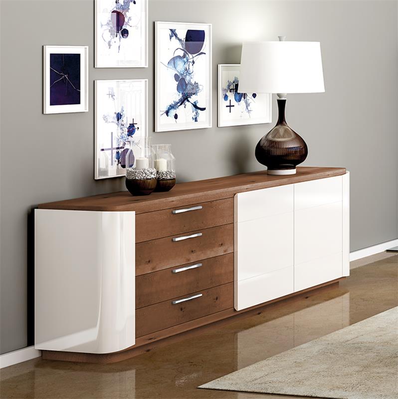 Вместительный комод с радиусными углами. Сочетает светло-древесный матовый цвет и белый глянцевый. Четыре просторные полки с удобными фурнитурными ручками.