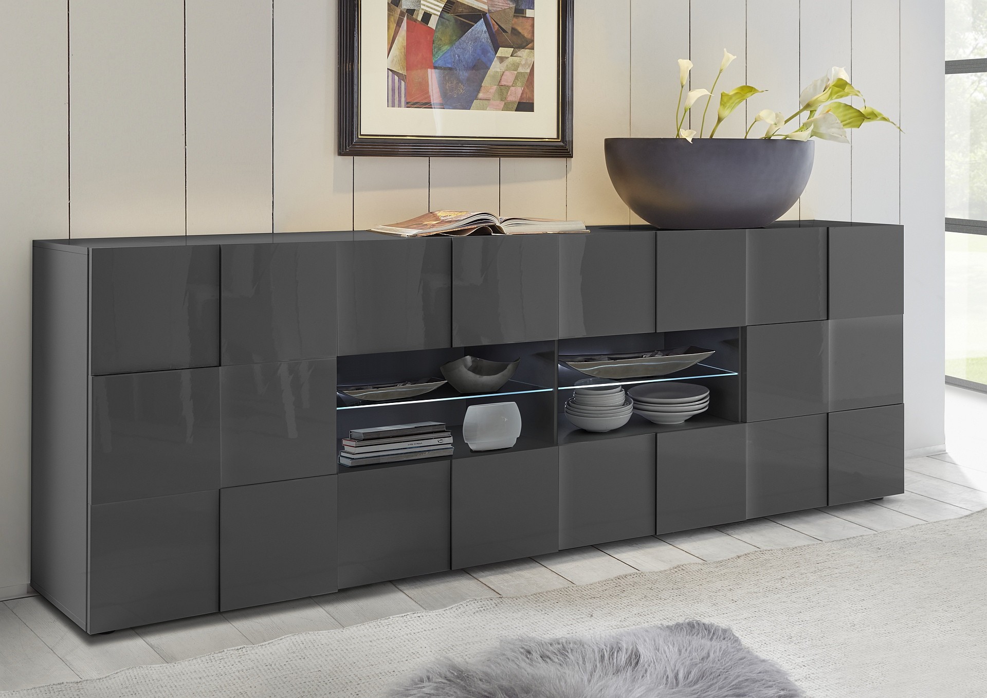 Широкий комод с большим количеством вместительных отделений прекрасно дополнит интерьер гостиной. Цвет фасадов темно-серый, глянцевый, сами фасады полок выступают на разном уровне формируя узор. В центре расположены стеклянные витрины.