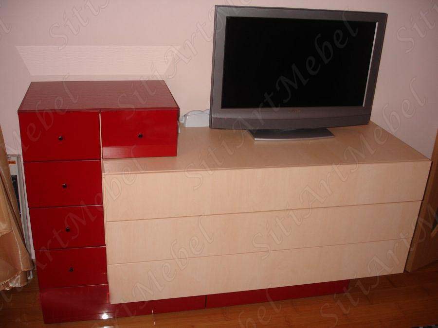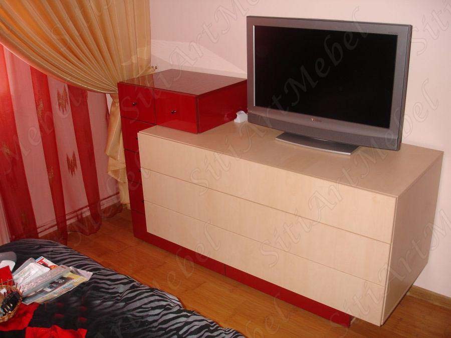Данную модель можно использовать как тумбу под телевизор. Основная часть конструкции, представленная в спокойном бежевом тоне, дополнена выдвижными ящиками ярко-красного цвета. Одной из главных особенностей модели является отсутствие на основной части фасадной фурнитуры, которая заменена современной системой.