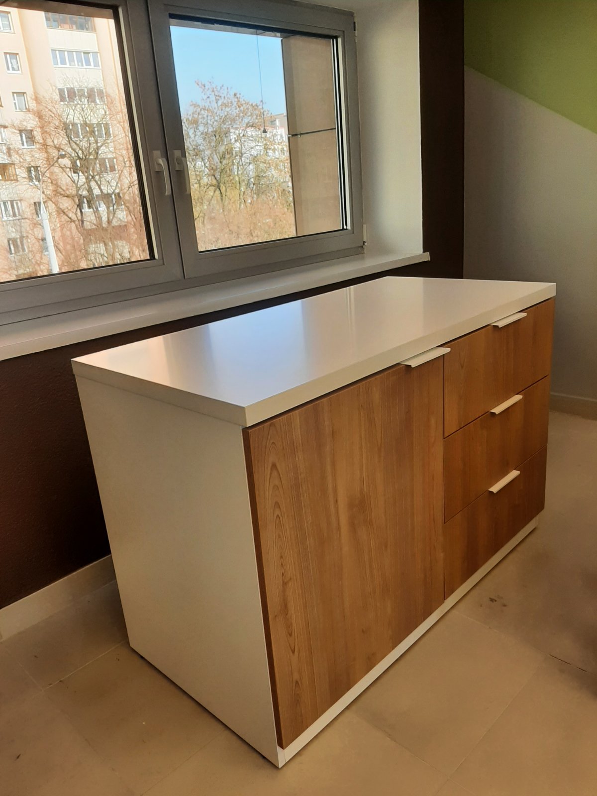 Матовый корпус и глянцевая створка. Четыре выдвижных ящика. Фасад без ручек.