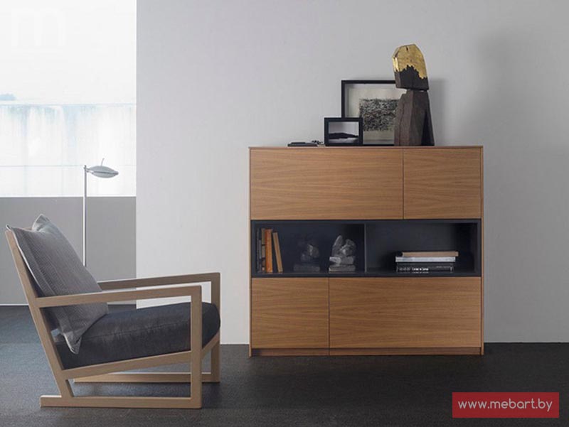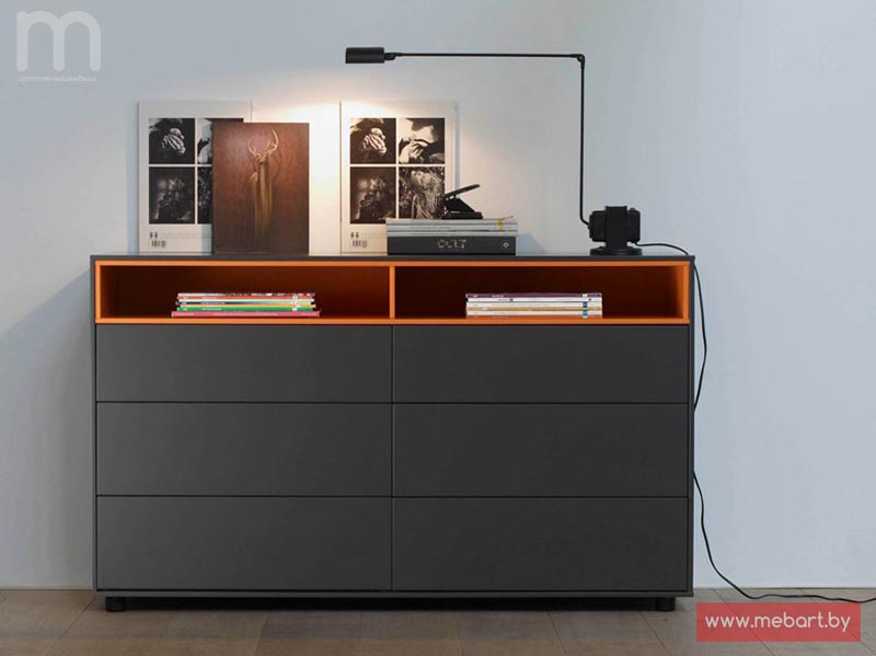 Вместительный комод, представленный в современном стиле, станет отличным дополнением интерьера любой из комнат в вашем доме. Комод разделен на несколько функциональных частей для хранения необходимых вещей. По центру расположено несколько выдвижных ящиков.