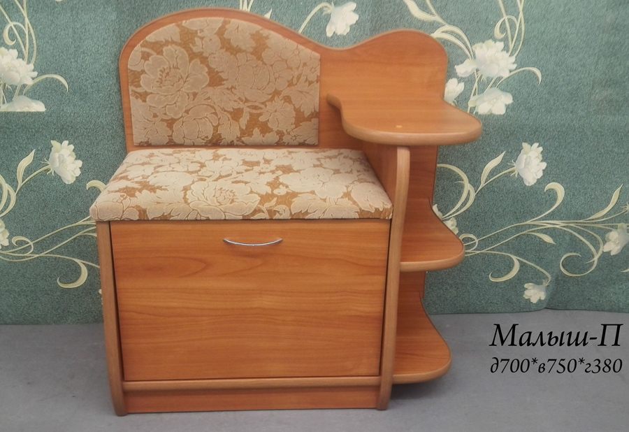 Тумба для обуви представляет собой компактную модель с тремя полочками сбоку. Крышка тумба служит сиденьем и обита мебельной тканью, для удобства предусмотрена спинка. Небольшие габариты делают модель практичной, позволяют ставить ее в любом месте.