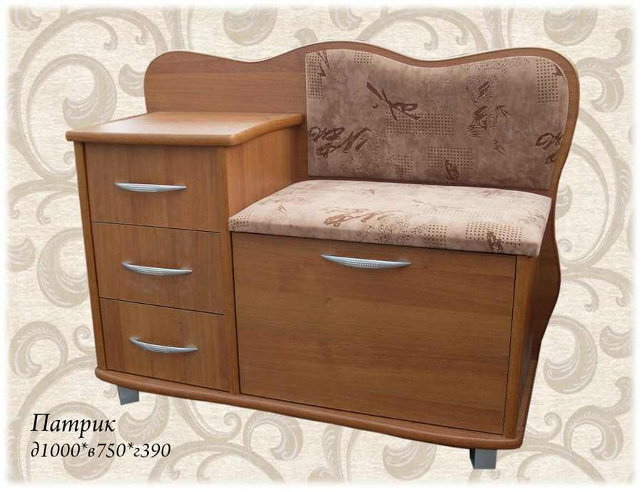 Тумба «Патрик» обладает мягким сиденьем и спинкой. Модель включает в себя три выдвижных ящика и один распашной. Конструкция отличается высокой прочностью и устойчивостью.