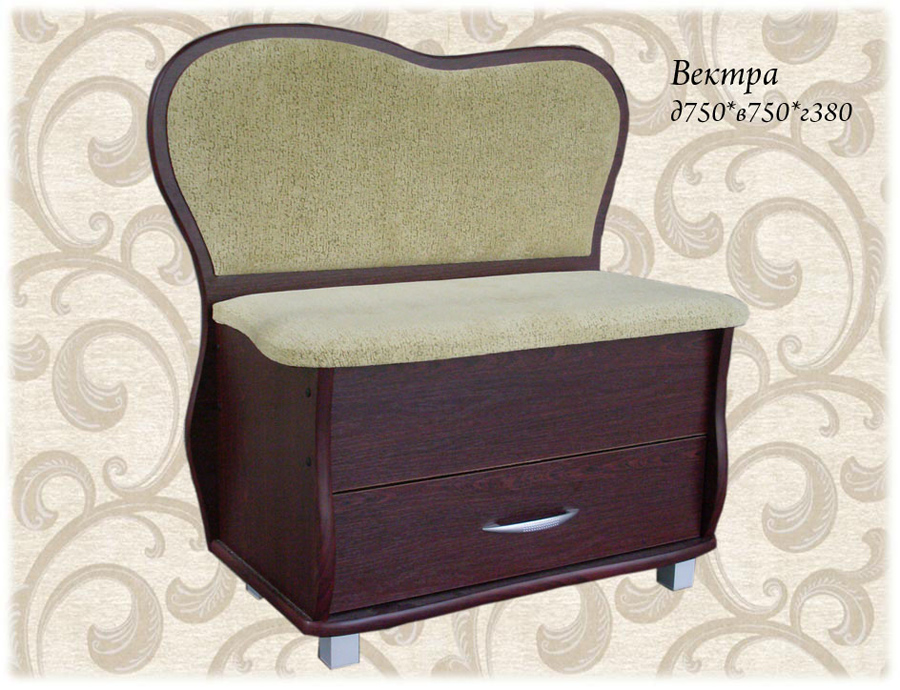 Тумба «Вектра» стоит на небольших металлических ножках. Каркас изготовлен из качественного ЛДСП цвета венге. Просторное сиденье позволит удобно расположиться, предусмотрена спинка.