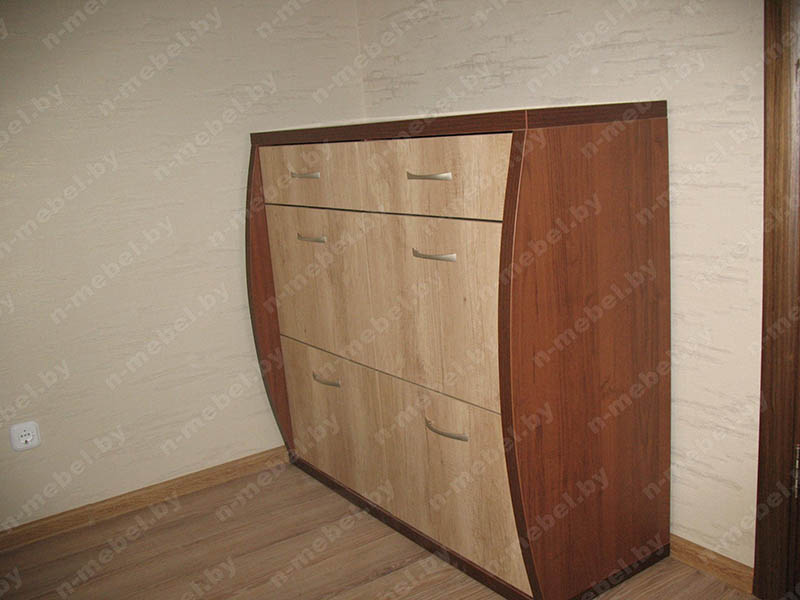 Представленный вместительный комод выполнен в темно-коричневом корпусе. Фасад гарнитура исполнен в светлом деревянном оттенке. Комод оснащен двумя небольшими выдвижными ящиками и четырьмя вместительными.