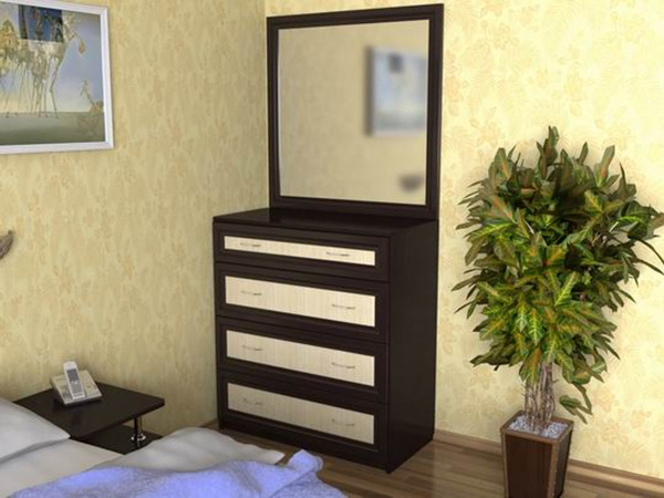 Комод с зеркалом – очень удобное решение для маленькой спальни. Такой комод может выполнять функцию туалетного столика, но с одним существенным недостатком – за ним едва ли будет удобно наносить макияж сидя из-за отсутствия ниши для ног. Многие производители предусматривают нишу, смещая выдвижные ящики в сторону, тем самым устраняя неудобство. Комоды с зеркалом могут иметь разную конструкцию и разное расположение элементов: некоторые дополнены полками и нишами, отдельные модели имеют откидную крышку-зеркало или вовсе выполняют функции трюмо.