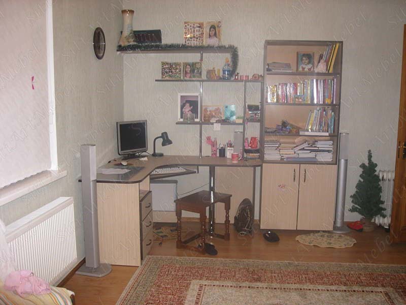 Угловой компьютерный стол, шкаф-столбик с шуфлядами и открытыми полками.