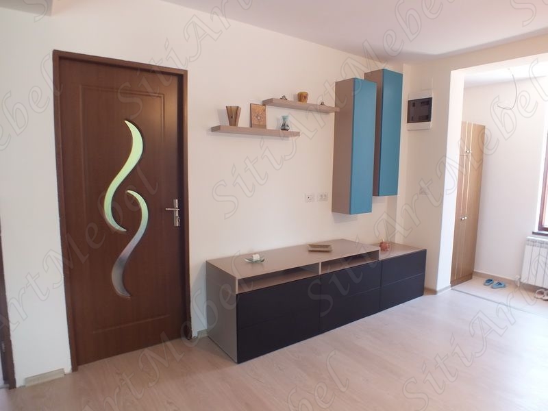 Приставная тумба и навесные модули в виде полок и ящиков.