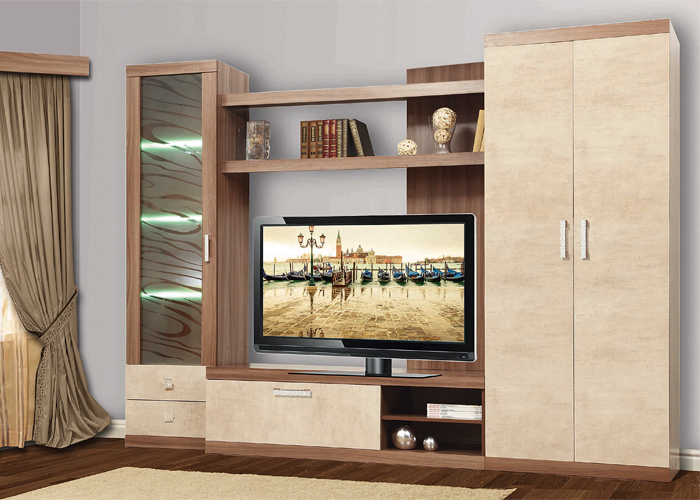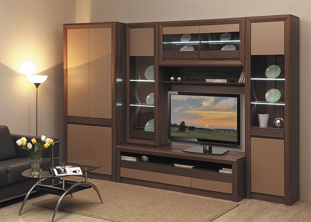 Стенка в строгой расцветке. Симметричный фасад с филенками и вставками стекла лакомат.