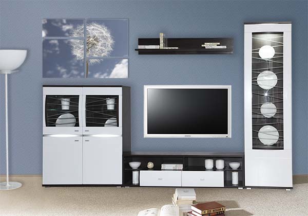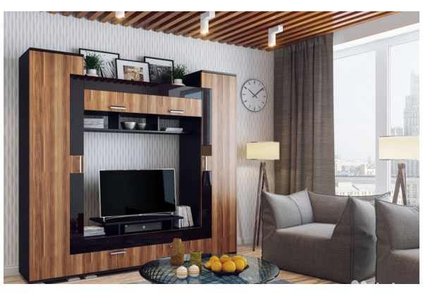 Современная стенка в темном минималистичном исполнении со вставкой каллиграфического принта.