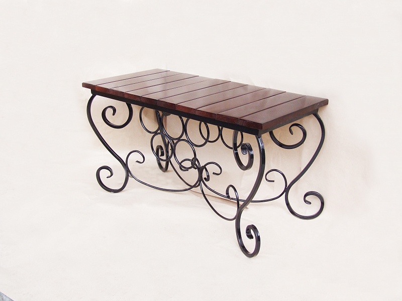Каркас столика изготовлен из стали стали. Пиломатериалом столешницы служит массив дерева хвойных пород. Для защиты от внешнего воздействия и в целях придания гарнитуру симпатичного внешнего вида деревянные элементы окрашены защитно-декоративным составом «Лазурь Про VIDARON». В свою очередь металлический каркас окрашен черной матовой эмалью «Belakor-15».