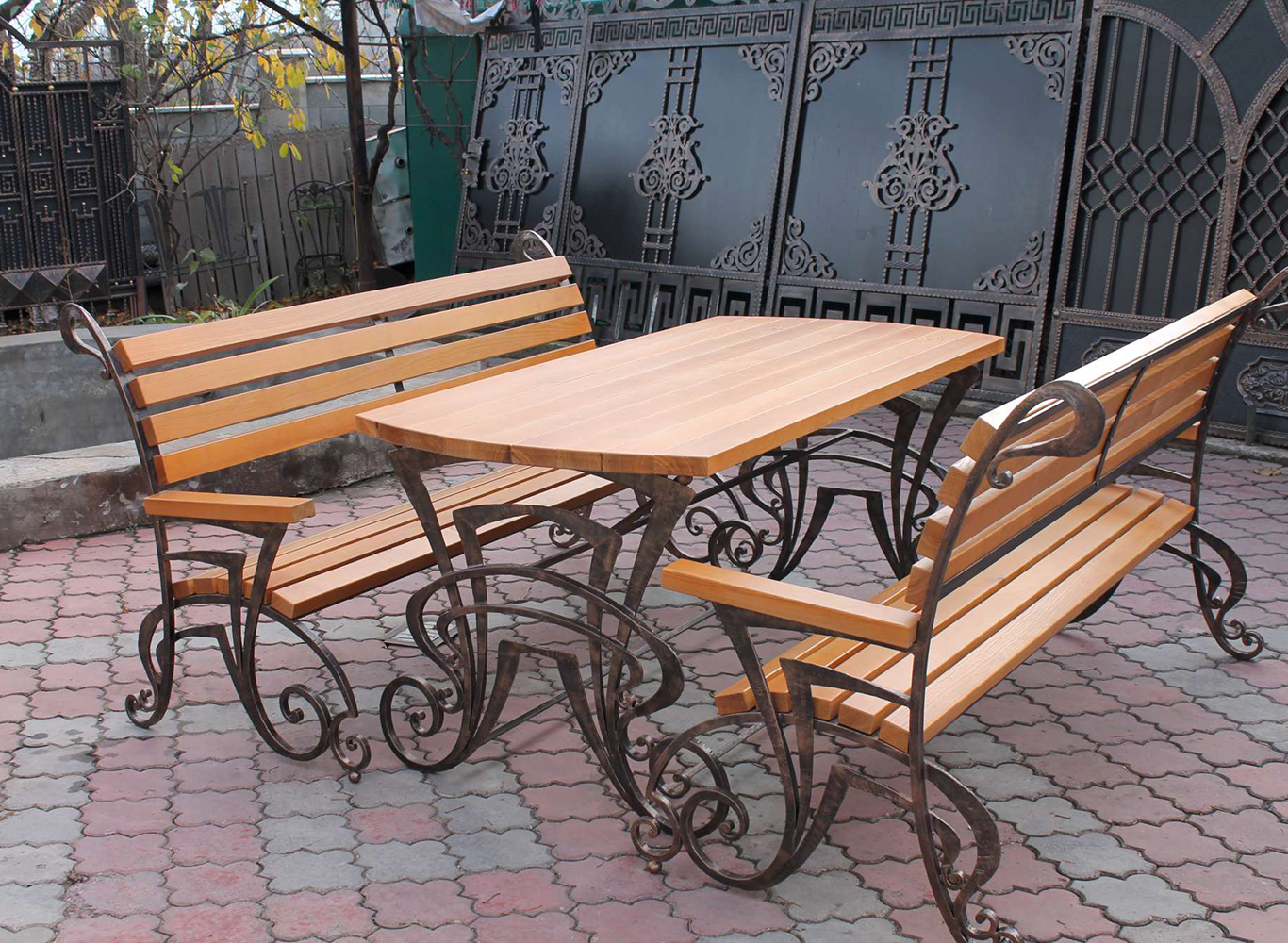 Брусчатые сиденья и цельная столешница из клееного бруса.