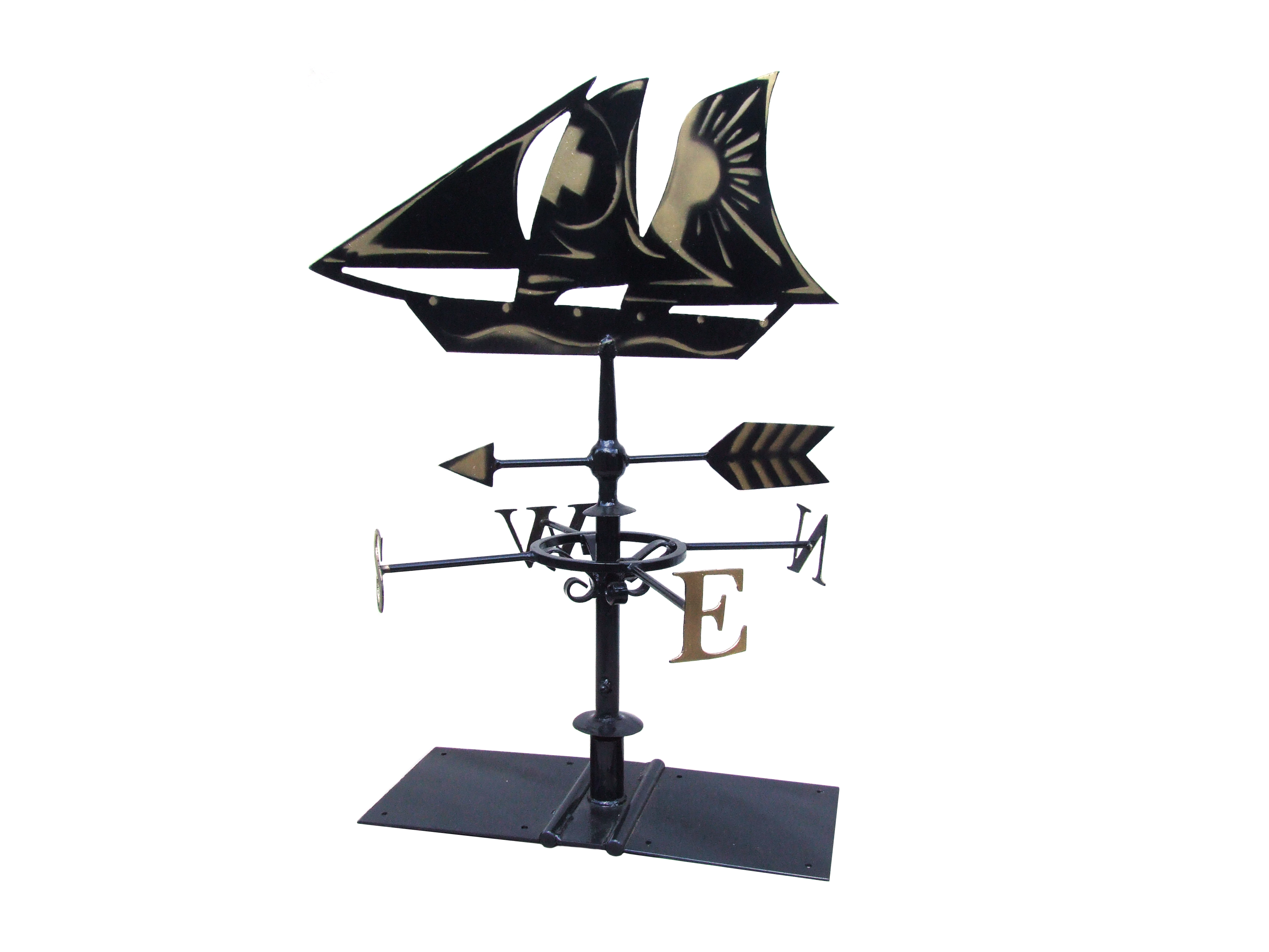 Флюгер в виде кораблика отличается особой креативностью и оригинальностью. Установка данного изделия на приусадебном участке или на крыше загородного дома вызовет море позитива у гостей дома или участка. Помимо декоративной функции, изделие выполняет и практическую, указывая направление ветра относительно четырех сторон света. Модель изготовлена путем ковки из металла.