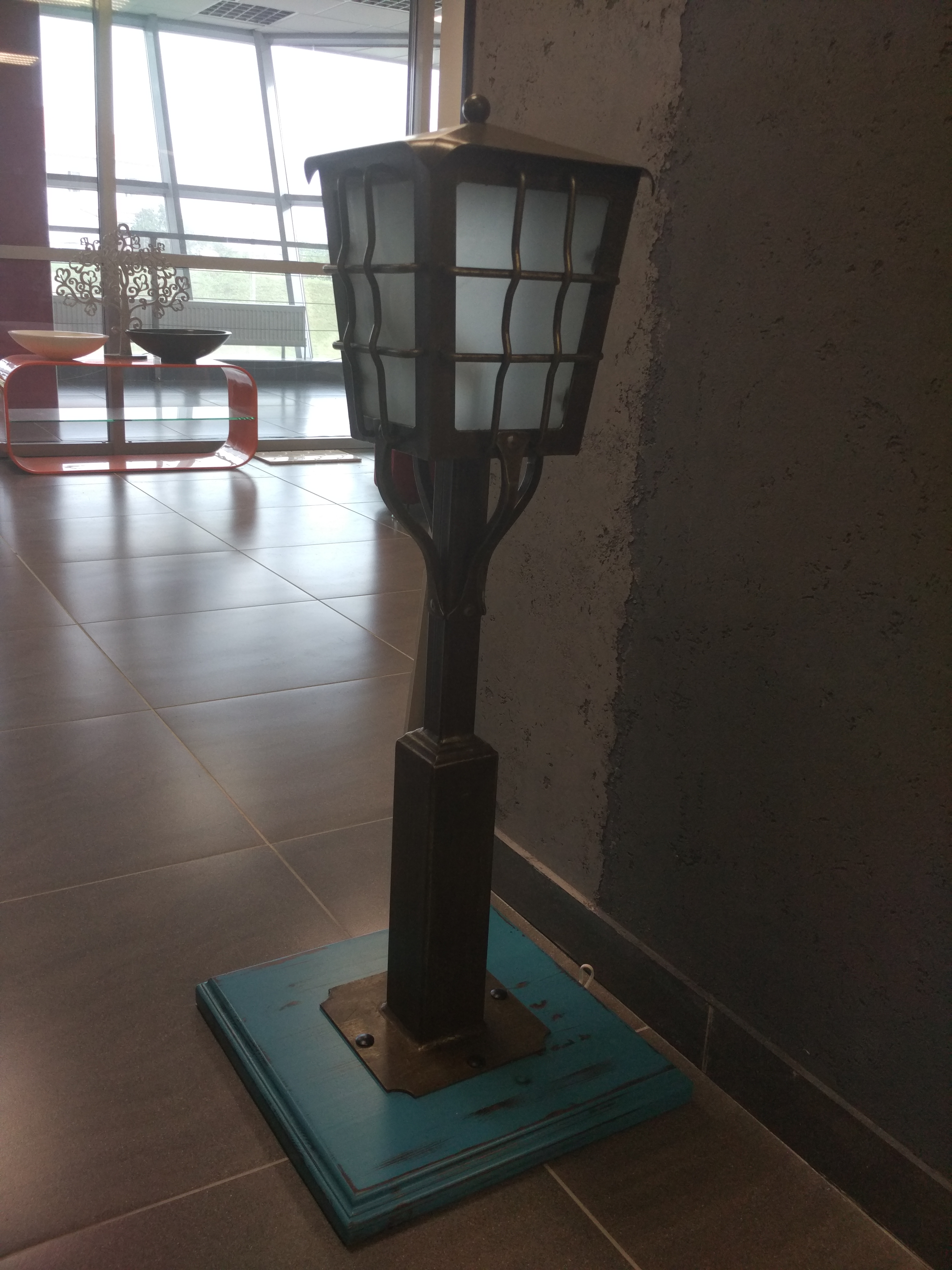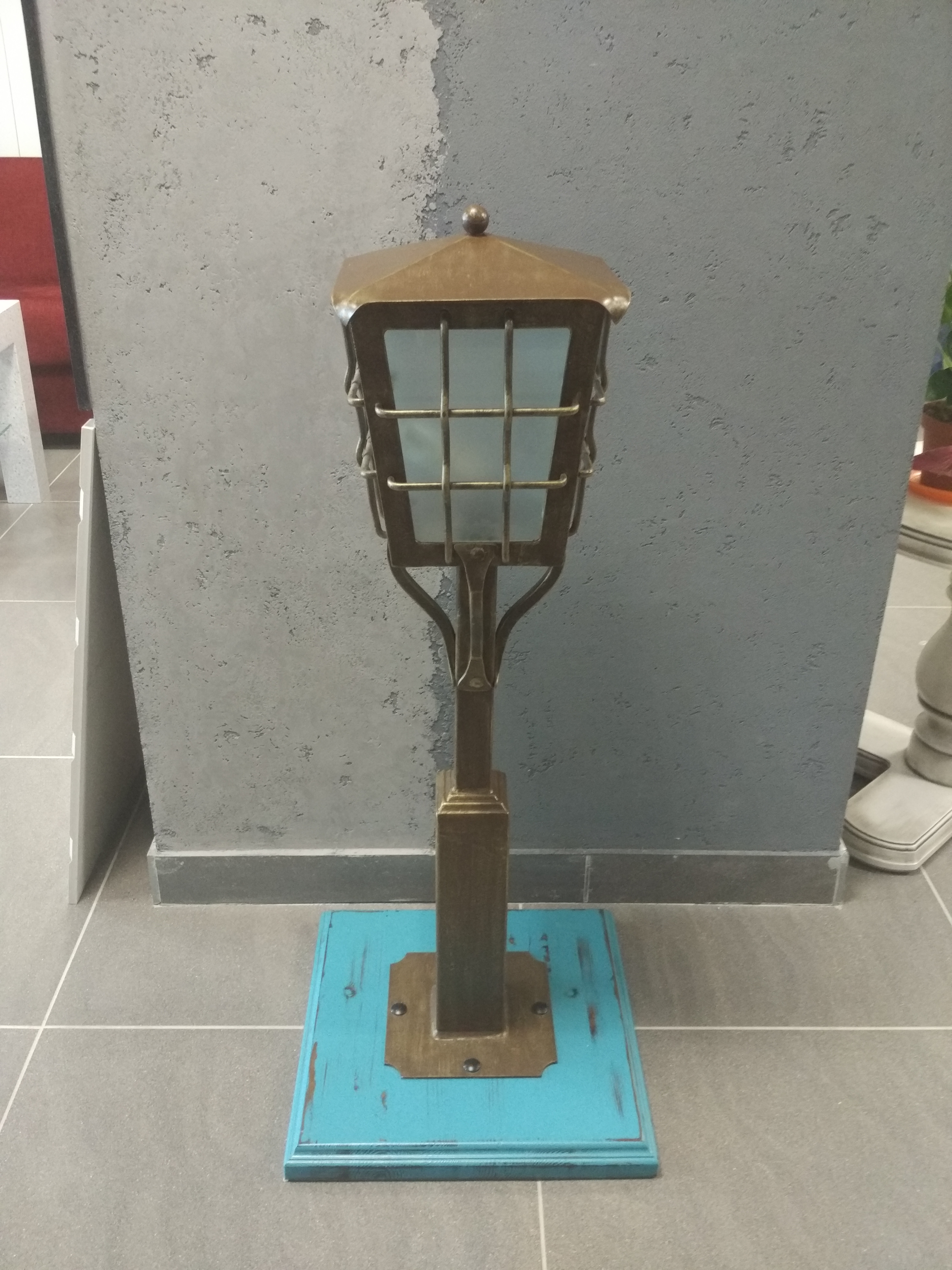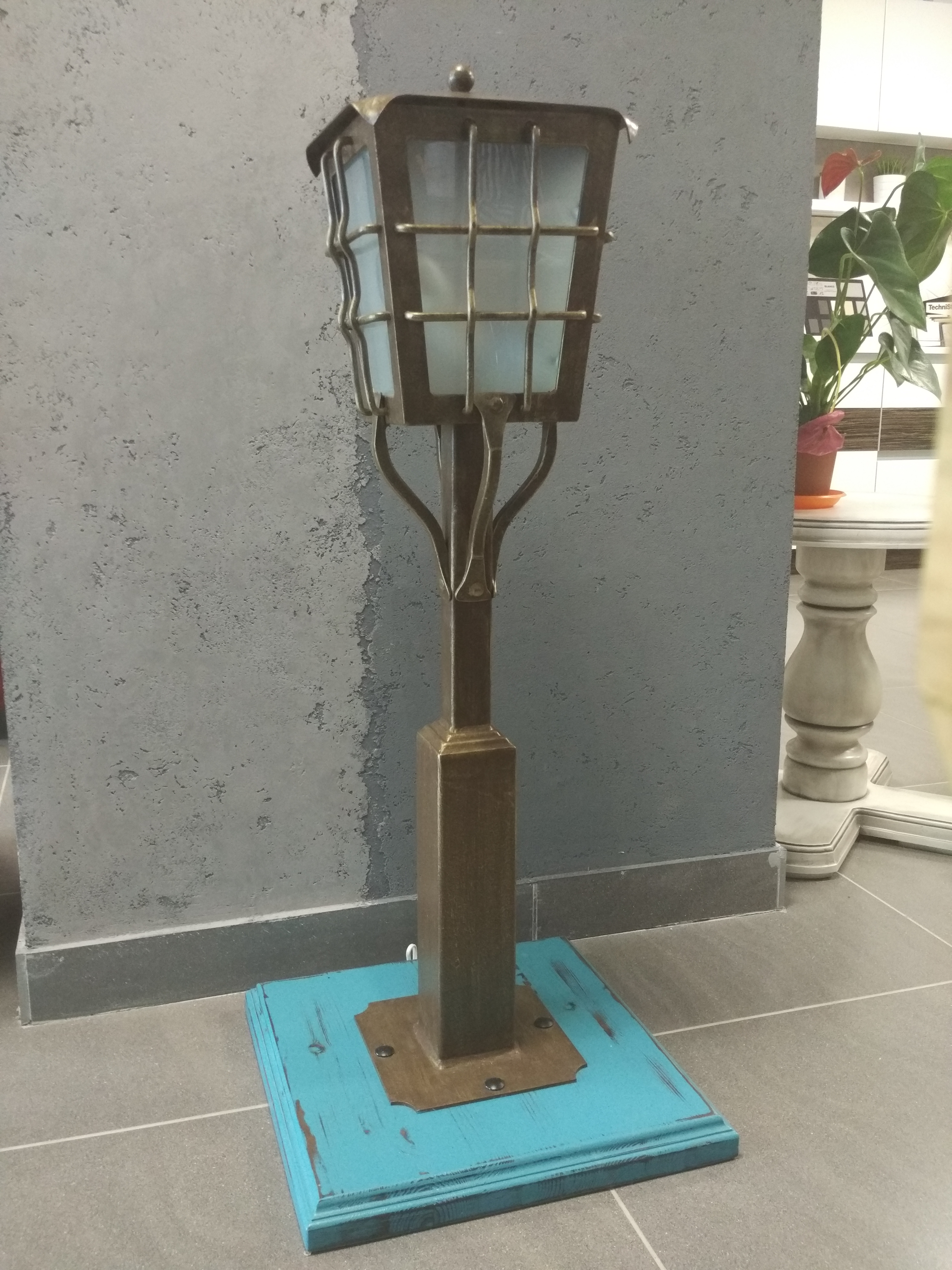 Фонарь с деревянной бирюзовой подставкой с патиной образует изысканную эстетичную композицию в ландшафтном дизайне. Винтажный светильник, представленный в корпусе под бронзу, вечером и ночью будет являться источником света, а днем будет стильным дополнением участка. Эффект патинирования, примененный в дизайне подставки, придаст композиции изысканный вид.