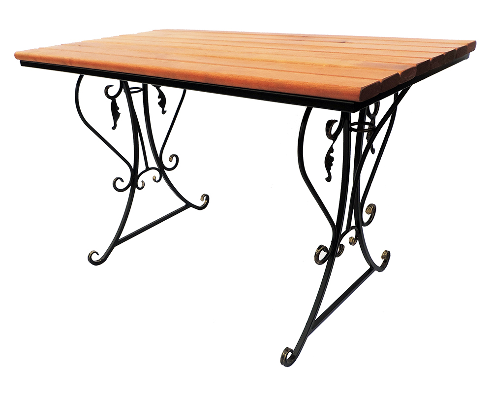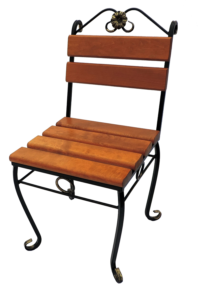 Комплект садовой мебели включает в себя два стула, две скамьи и стол. Каркасы всех моделей выполнены из кованого металла, сиденья и спинки, а также столешница стола – из дерева. Набор отлично подойдет для непринужденных посиделок в саду.