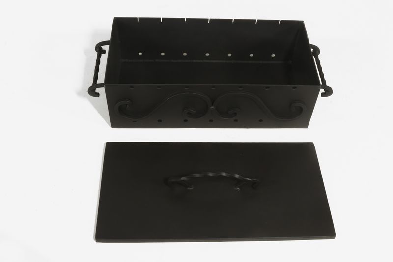 Размер жаровни: длина - 600 мм.; высота - 180 мм.; ширина - 300 мм., жаровня съемная, со съемной крышкой, окрашена термостойкой краской RAL 9005 серо-черного цвета