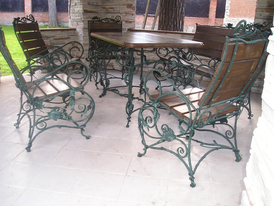 Дощатые сиденья с откинутыми спинками на изогнутой опоре грубой ковки с патинированным растительным узором.