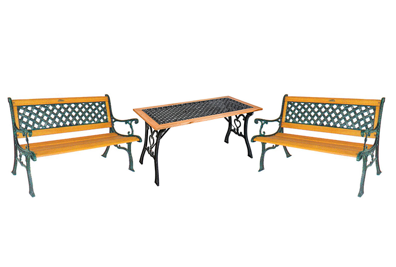 Набор садовой мебели состоит из стола и двух широких лавок. Все изделия имеют чугунный каркас, сиденья изготовлены из дерева. Столешница стола имеет отверстие для зонта. При изготовлении использованы качественные материалы, которые придают изделиям высокую прочность и долговечность. Располагать данный мебельный набор можно как на крытой террасе, так и под открытым небом.