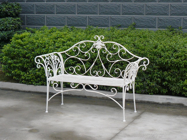 Компактная двухместная скамья полностью выполнена из металла художественной ковки. Ажурные кованые узоры украшают гнутые подлокотники и фигурную наклонную спинку, а сиденье возвышается на тонких и прочных прутьях ножек с устойчивыми наконечниками. Особый шик скамейке придает белый цвет, который будет выделяться на фоне летней зелени, придавая саду законченный вид с намеком на утонченный вкус. Долговечной металлической конструкции не страшны невзгоды погоды, а белизна покрытия, по случаю, легко возобновляется.
