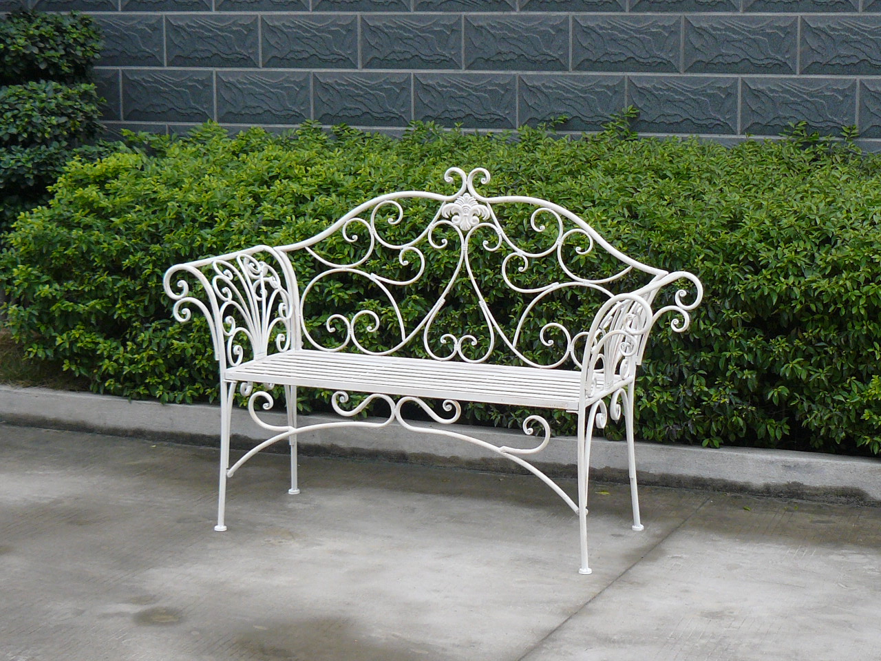 код 82757Белая эмалированная скамья с кованой спинкой и бортами.