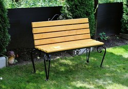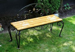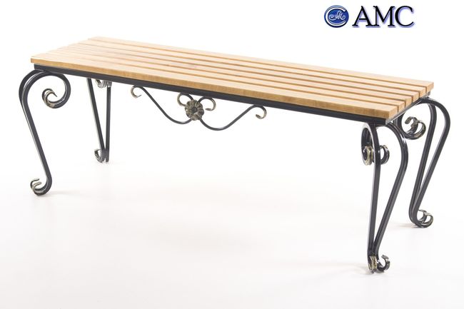 Садовая скамья выполнена без спинки. Прямоугольное деревянное сиденье рассчитано на посадку до 4 человека. Кованые ножки являются не только прочной и надежной опорой конструкции, но и декоративным элементом скамьи. Для защиты древесины от различных атмосферных воздействий используется специальный лак.