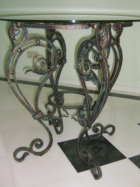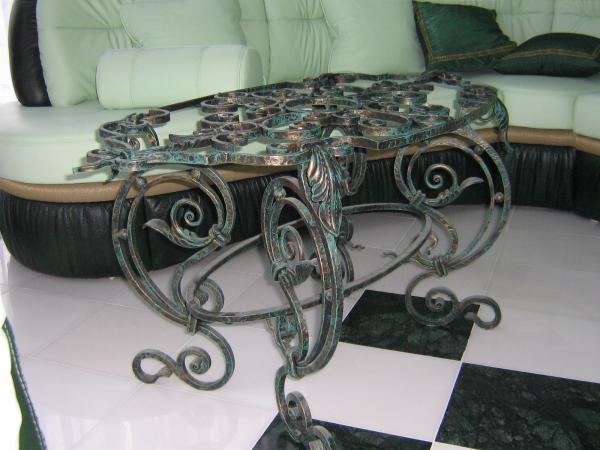 Ковка для столика применяется на ножках с различным декором в виде лепестков, завитков, листочков и других кованых элементов, которые выполняются вручную.