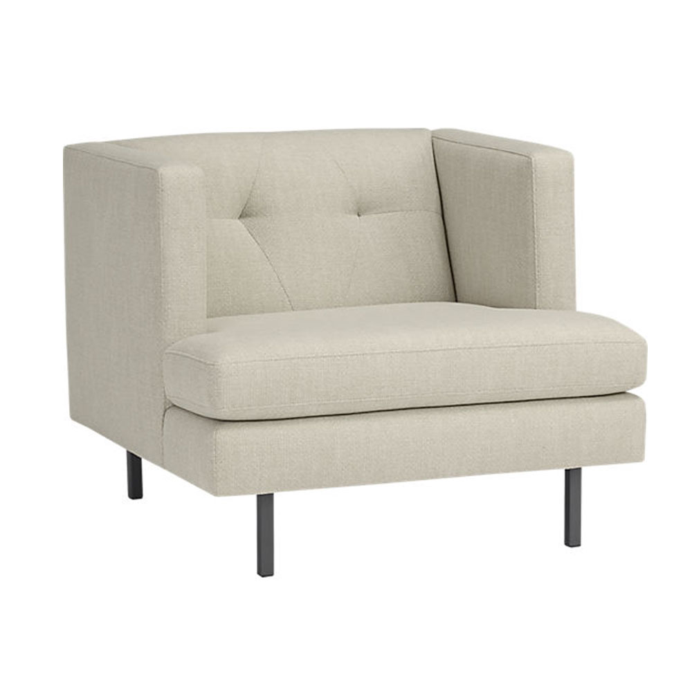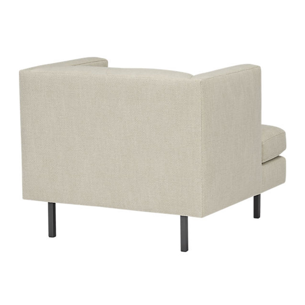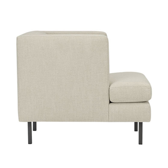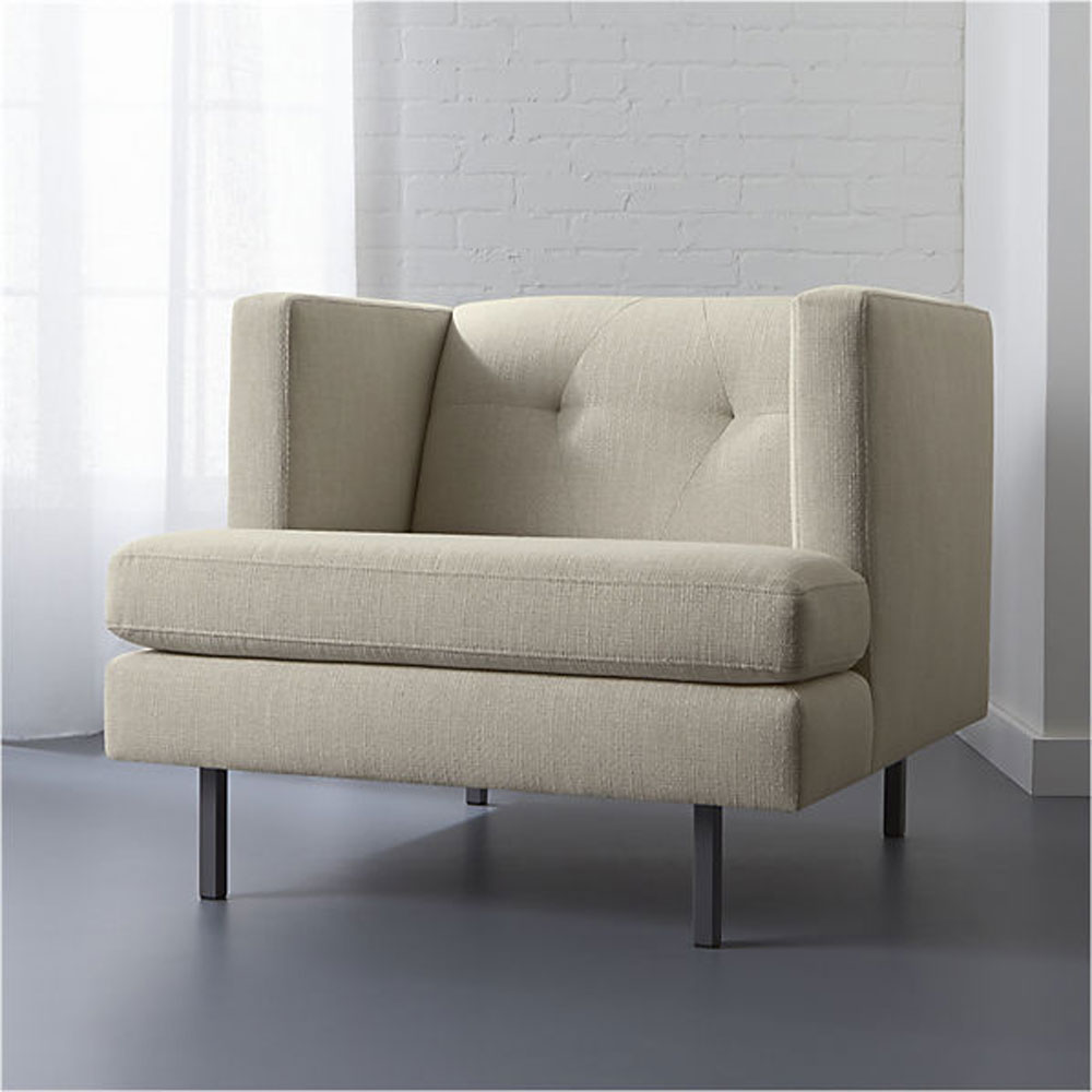 Оригинальное дизайнерское "кубическое" кресло в белой рогожке на серых тонких ножках. Прямоугольные подлокотники вровень со спинкой врезаются в эластичное сиденье в виде накладного пуфика. Мягкая спинка в лаконичной простожке.