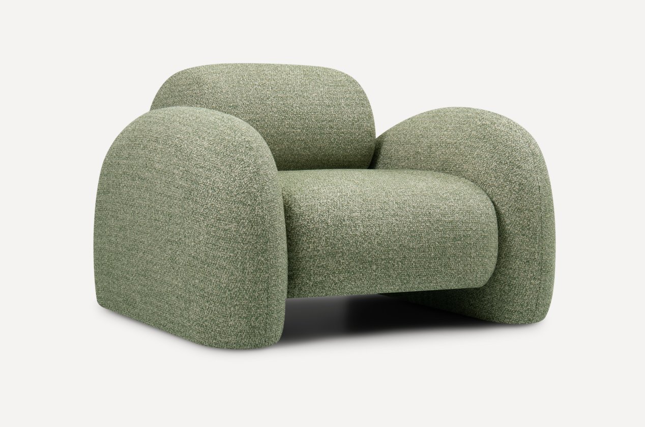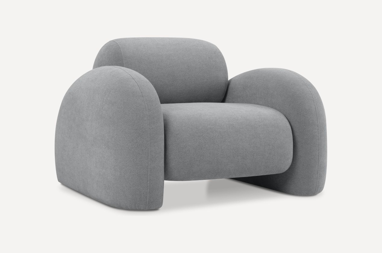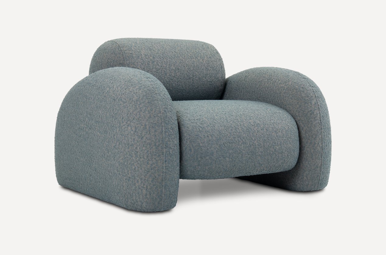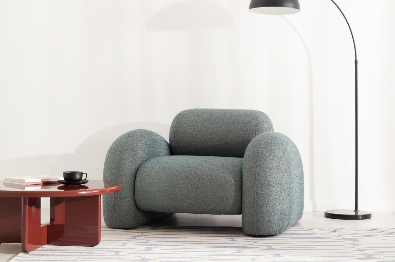 Мягкое кресло в тканевой обивке лазурного цвета.