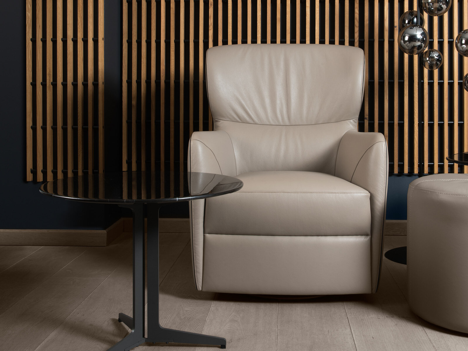 Модель KLER Leonardo доступна в следующих конфигурациях: только кресло или кресло с пуфом, который можно использовать как подставку для ног (пуф из черной ткани Dalmine).
