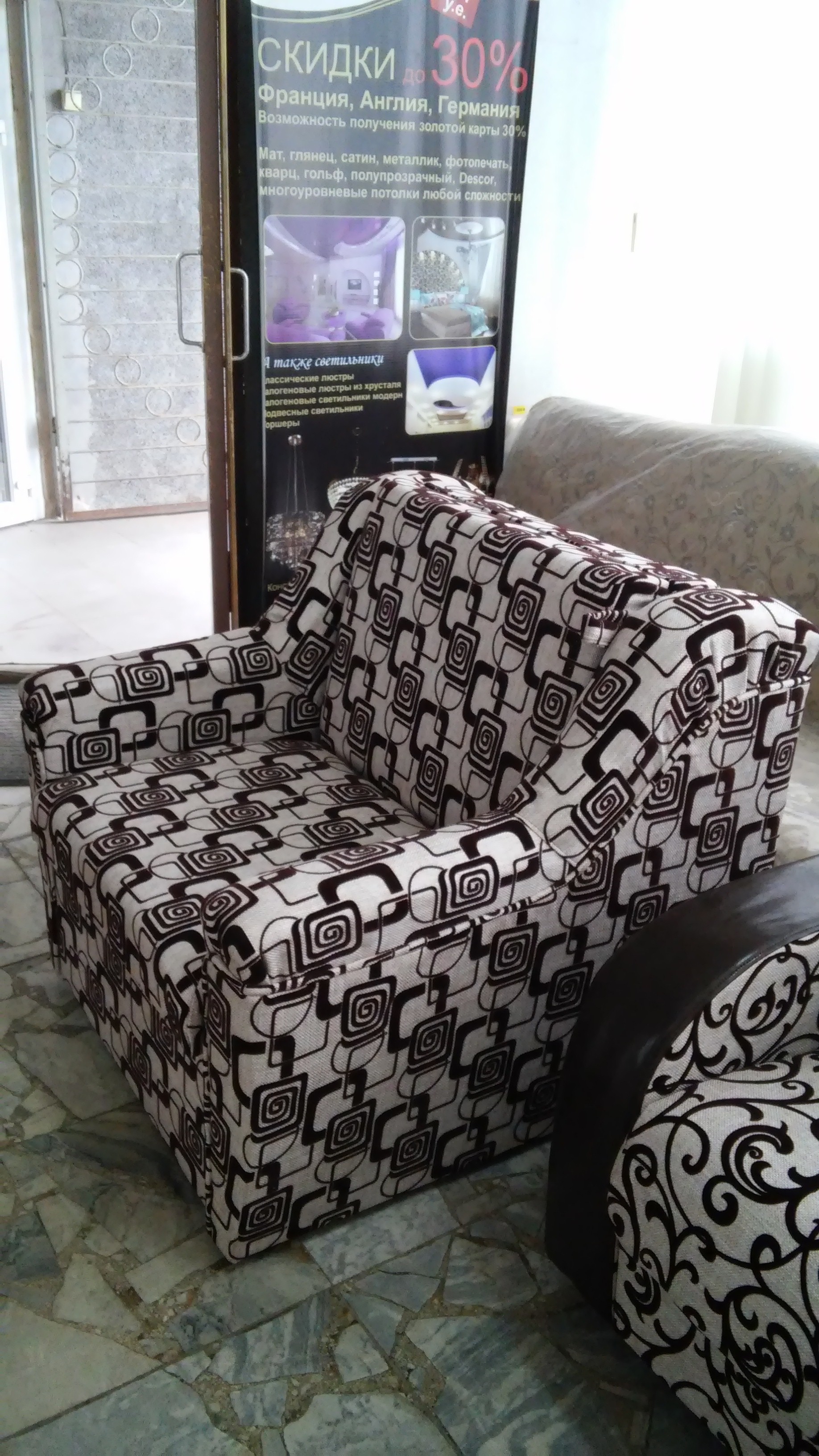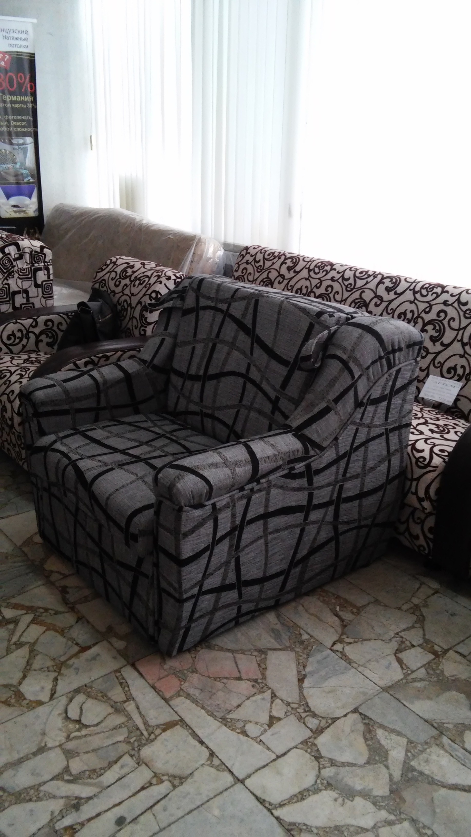 код 84008Мягкое кресло-кровать с фигурными подлокотниками с несколькими вариантами рисунка тканевой обивки.