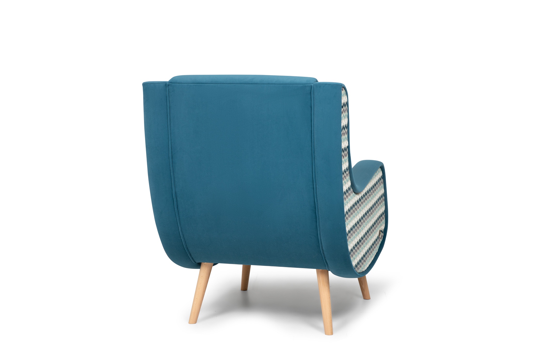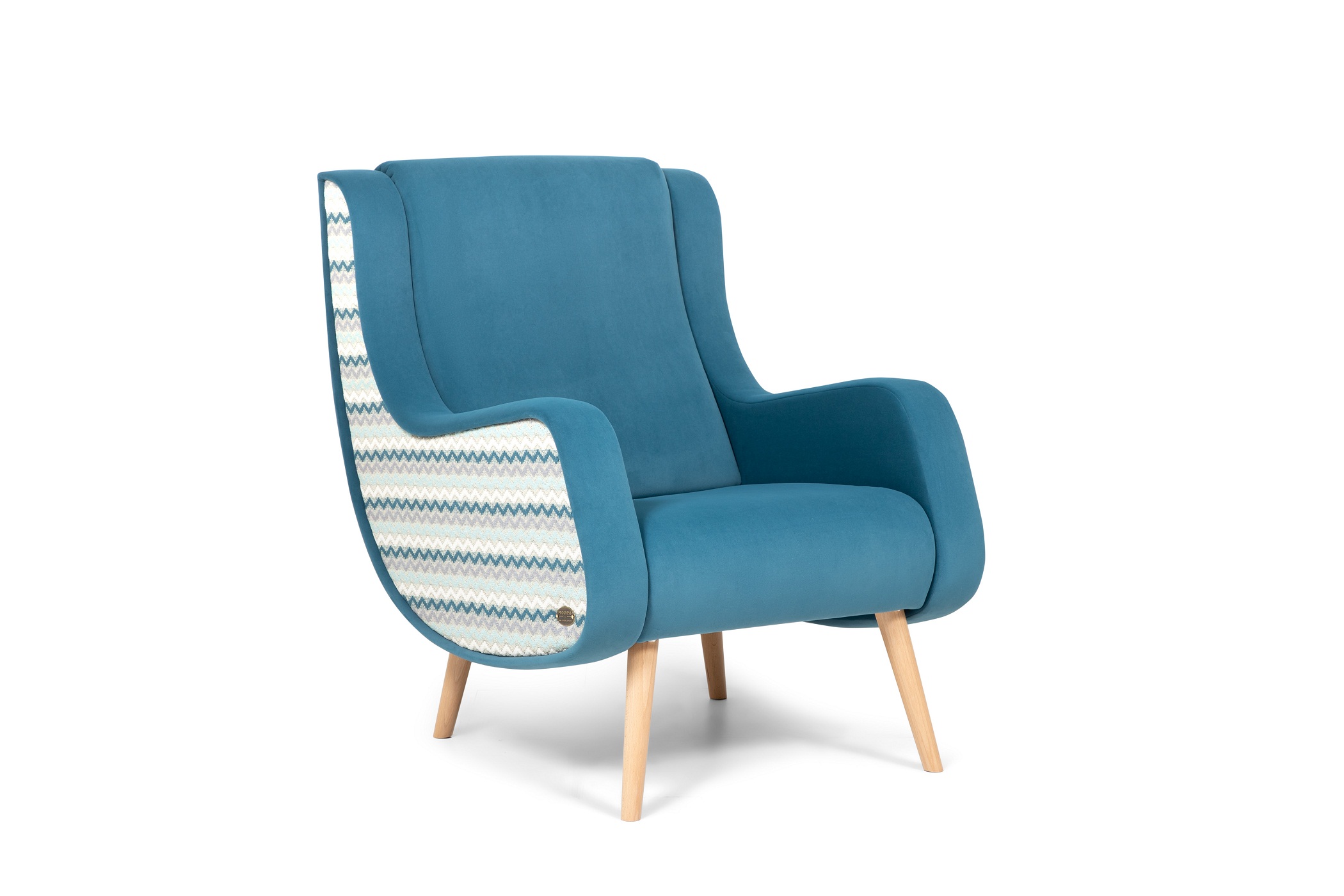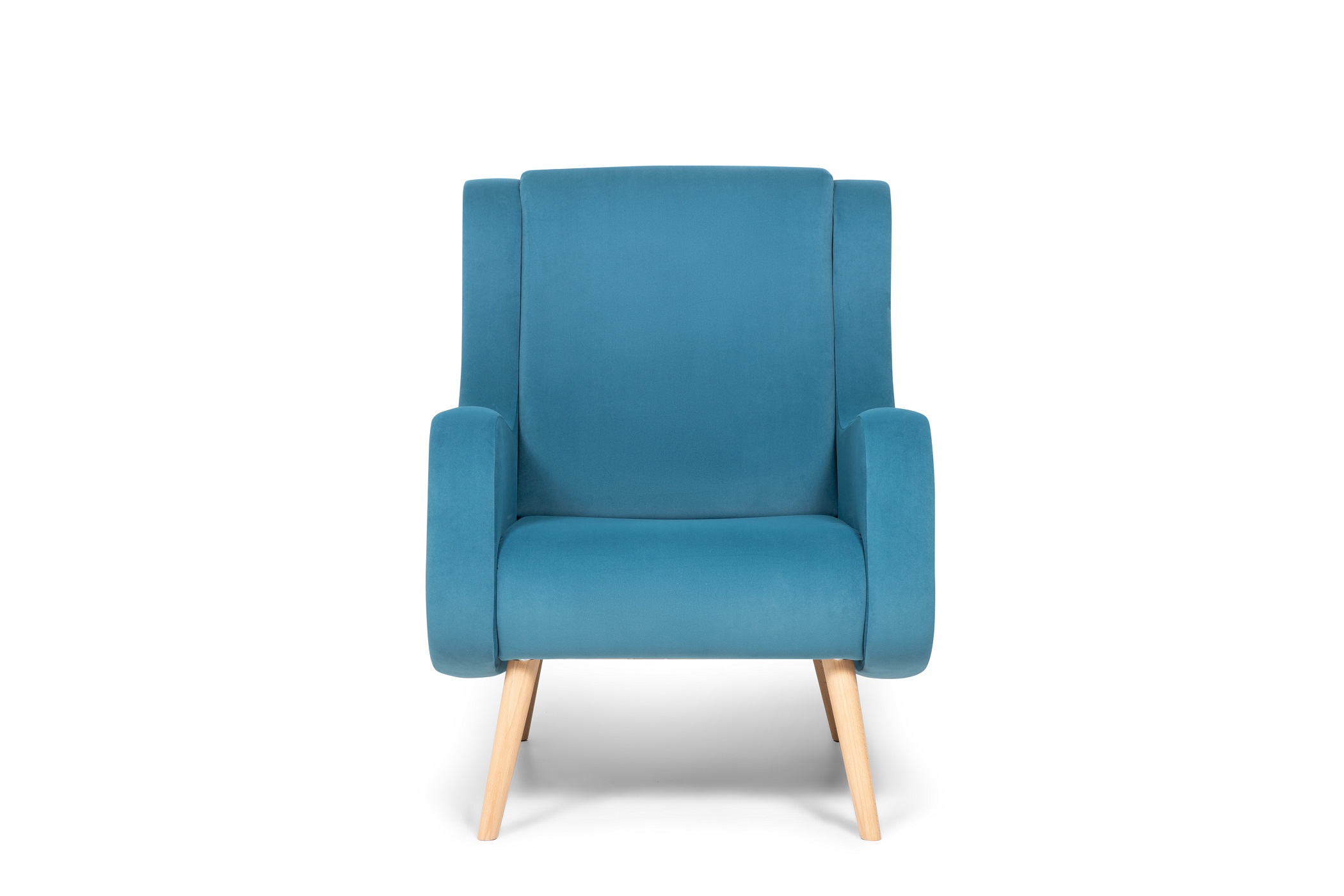 Мягкое кресло в тканевой обивке лазурного цвета.