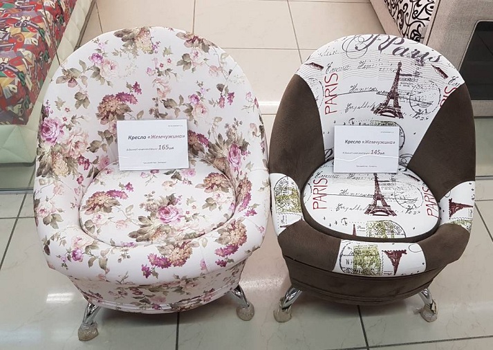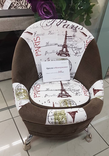 Мягкие кресла «Жемчужина» по форме отдалённо напоминают створки раковины моллюска. Приятные и мягкие подушки сглаживают упругие края спинки. Бархатистая обивка комбинированного коричневого цвета сочетается с белой тканью в рисунке на тематику "вояж в Париж".
