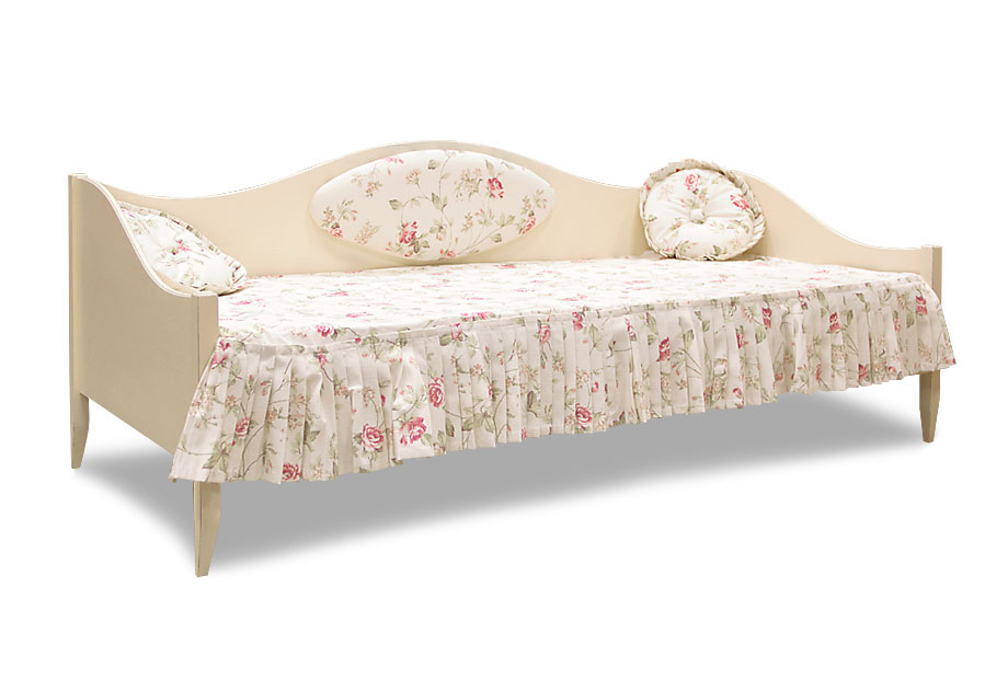 Детская тахта белорусского производства в корпусе из натурального массива сосны в белой эмали. Фигурная кромка волной пристенного бортика и спинок. Высокие ножки.