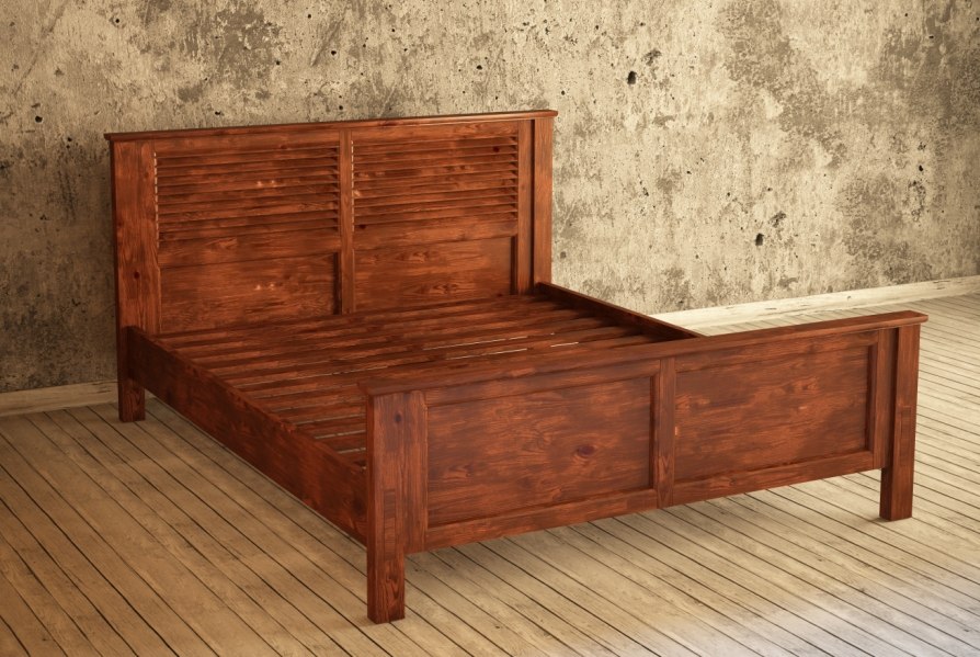 Двуспальная кровать для классического интерьера в строгой расцветке под орех из натурального массива. Высокие прямоугольные спинки и изголовье со вставкой неподвижных жалюзи. Массивные надежные ламели и деревянные ножки.