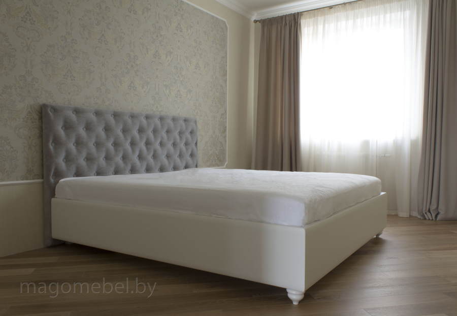Имея в своем дизайне мягкие и плавные линии, кровать впишется в практически любой интерьер. Светлые тона, в которых выполнена модель, придадут вашей спальне легкость и сделают комнату еще просторнее. Спинка кровати декорирована стяжкой, а отличную устойчивость конструкции придают ножки, представленные в оригинальной форме.