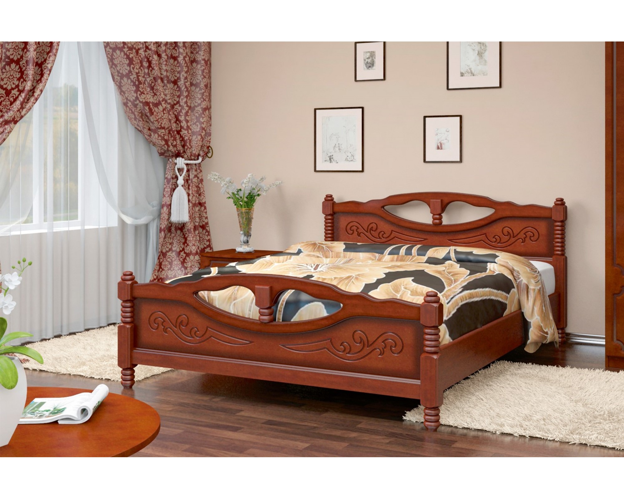 Кровать Елена-4 отлично подойдут тем, кто предпочитает классику: массив сосны, натуральные древесные оттенки, плавные формы, изящная резьба, ажурные вставки.