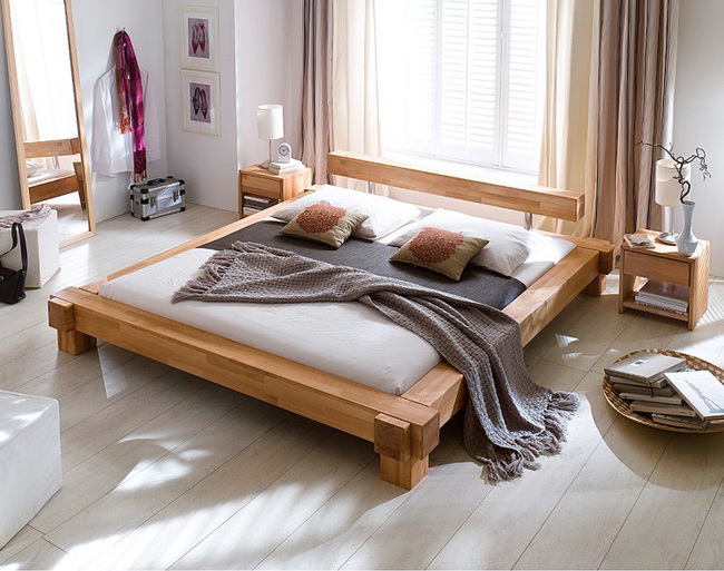 Кровать имеет низкую посадку, а в качестве опор выступают крупные ножки с квадратным сечением.