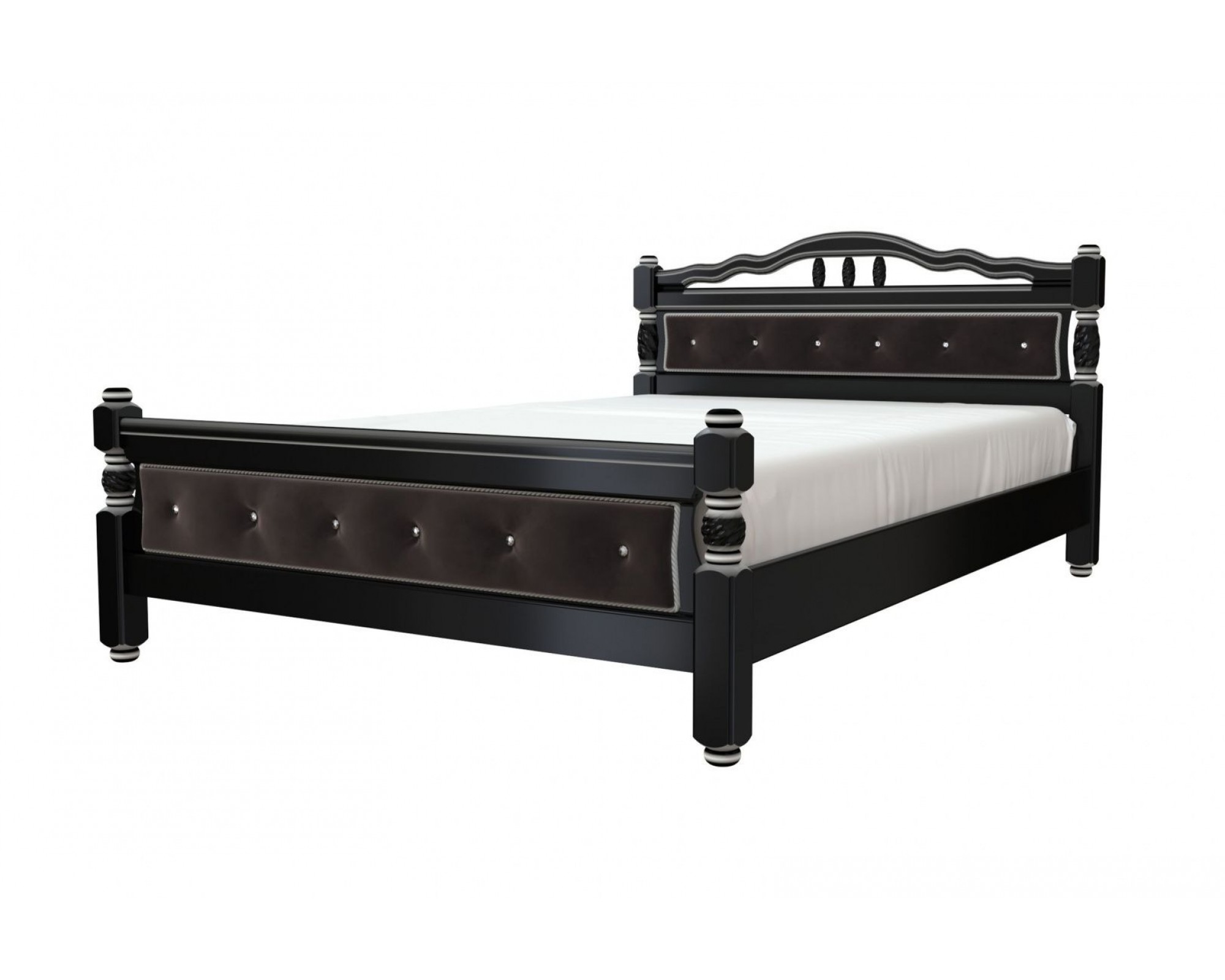 Спинки кровати Карина-11 украшены мягкими вставками и декоративными металлическими гвоздиками, а ножки - резными деревянными элементами, которые придают ощущение легкости и выразительного шарма. Кровать из массива Карина-11 особенно эффектно будет смотреться в классическом интерьере.