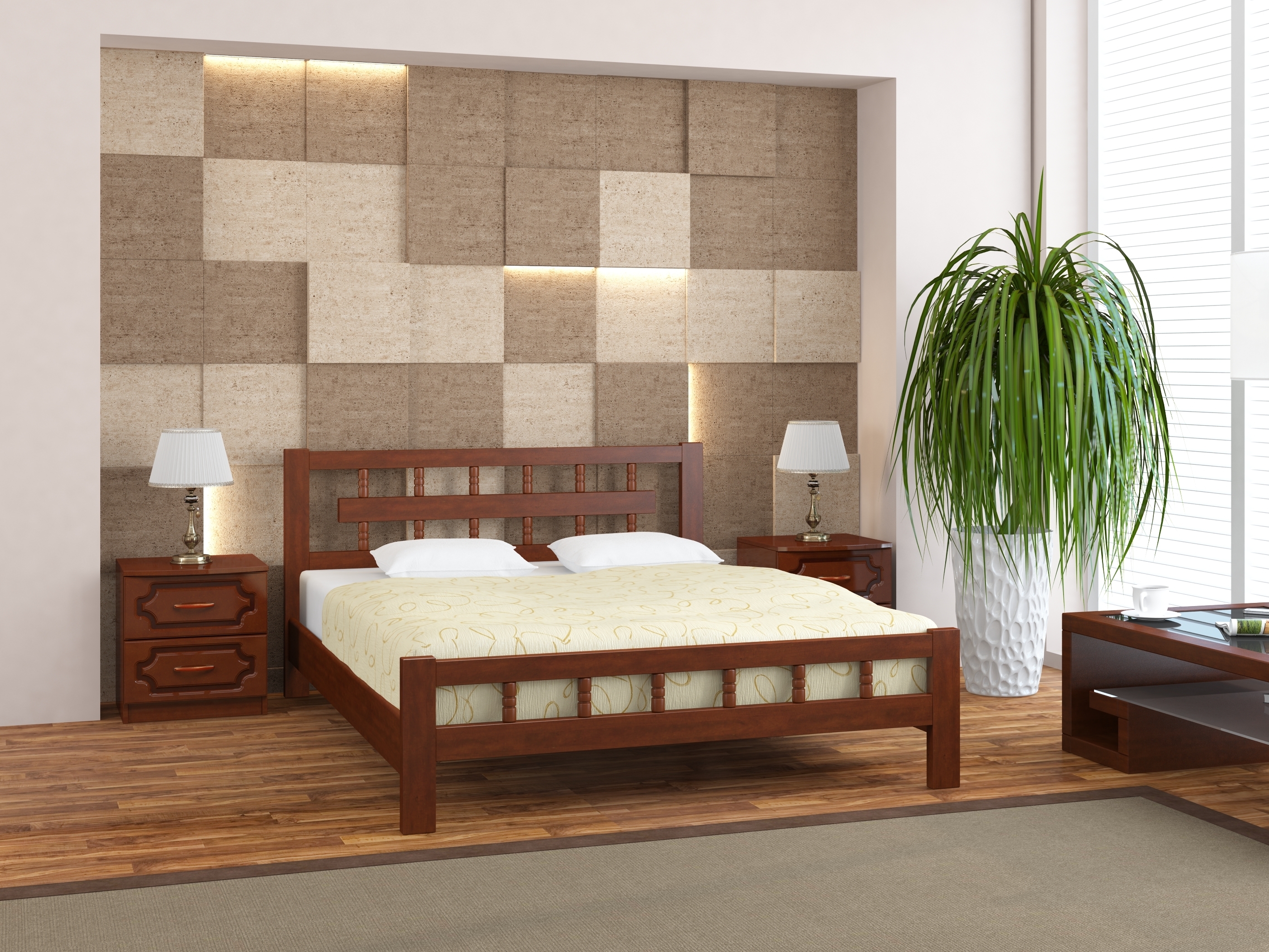 Кровать из массива с декоративной стяжкой в изголовье и ножной спинке.