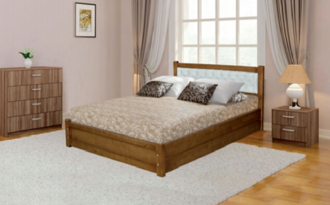 Размер на выбор заказчика. Кровать массивной конструкции с закрытым каркасом и открытыми торцами. Изголовье со стеганной обивкой.