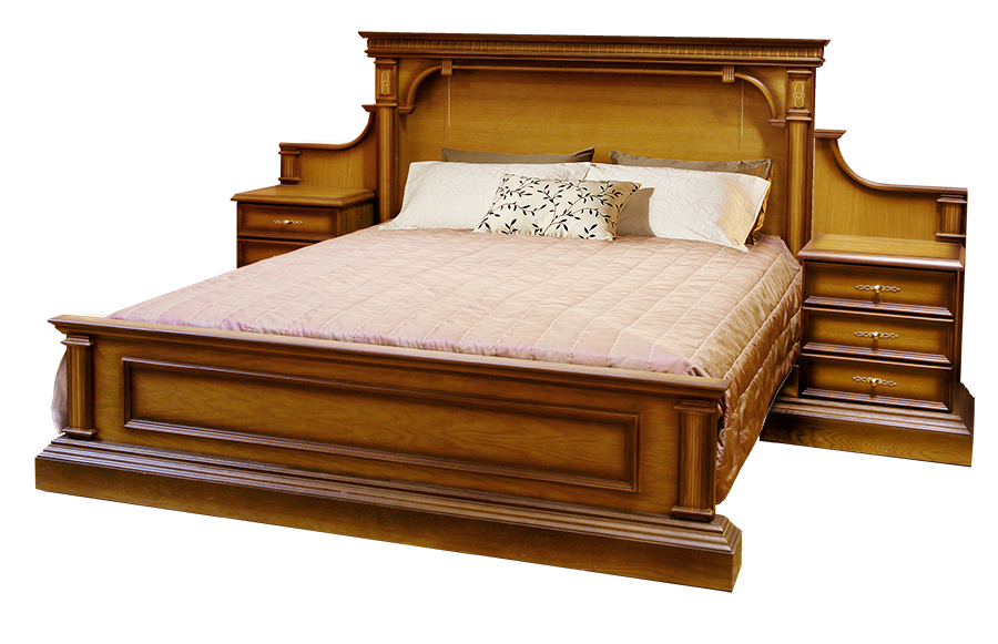 Кровать в классическом викторианском стиле, с присущей ему строгой расцветкой под орех, ажурной и неброской резьбой по дереву с арочными элементами, филенками, массивным основанием и пилястрами. Прямоугольное изголовье образует небольшую нишу наподобие алтаря, идет в едином каркасе с двумя прикроватными тумбами на три выдвижных ящика с миниатюрными ручками-кнопками с латунным блеском.
