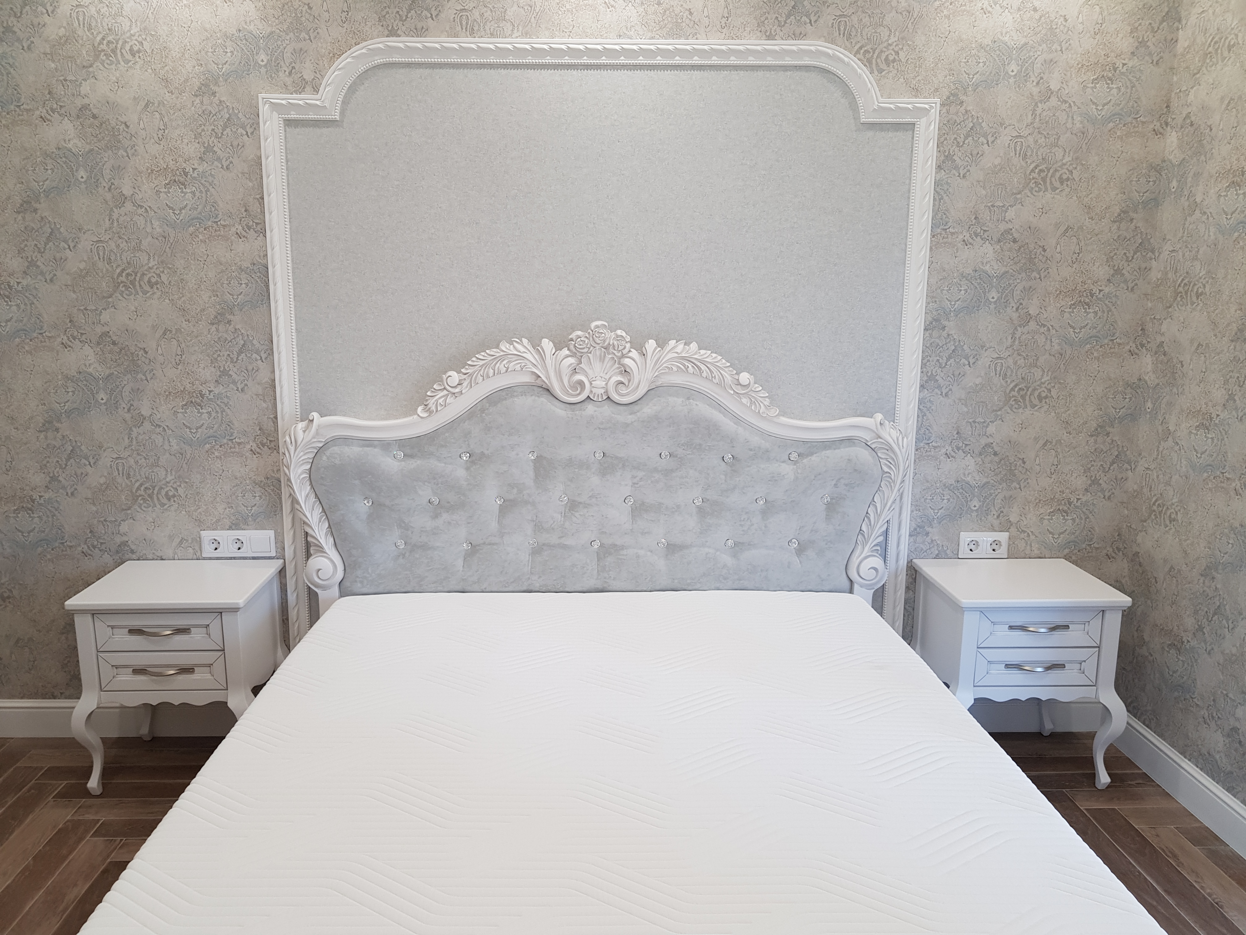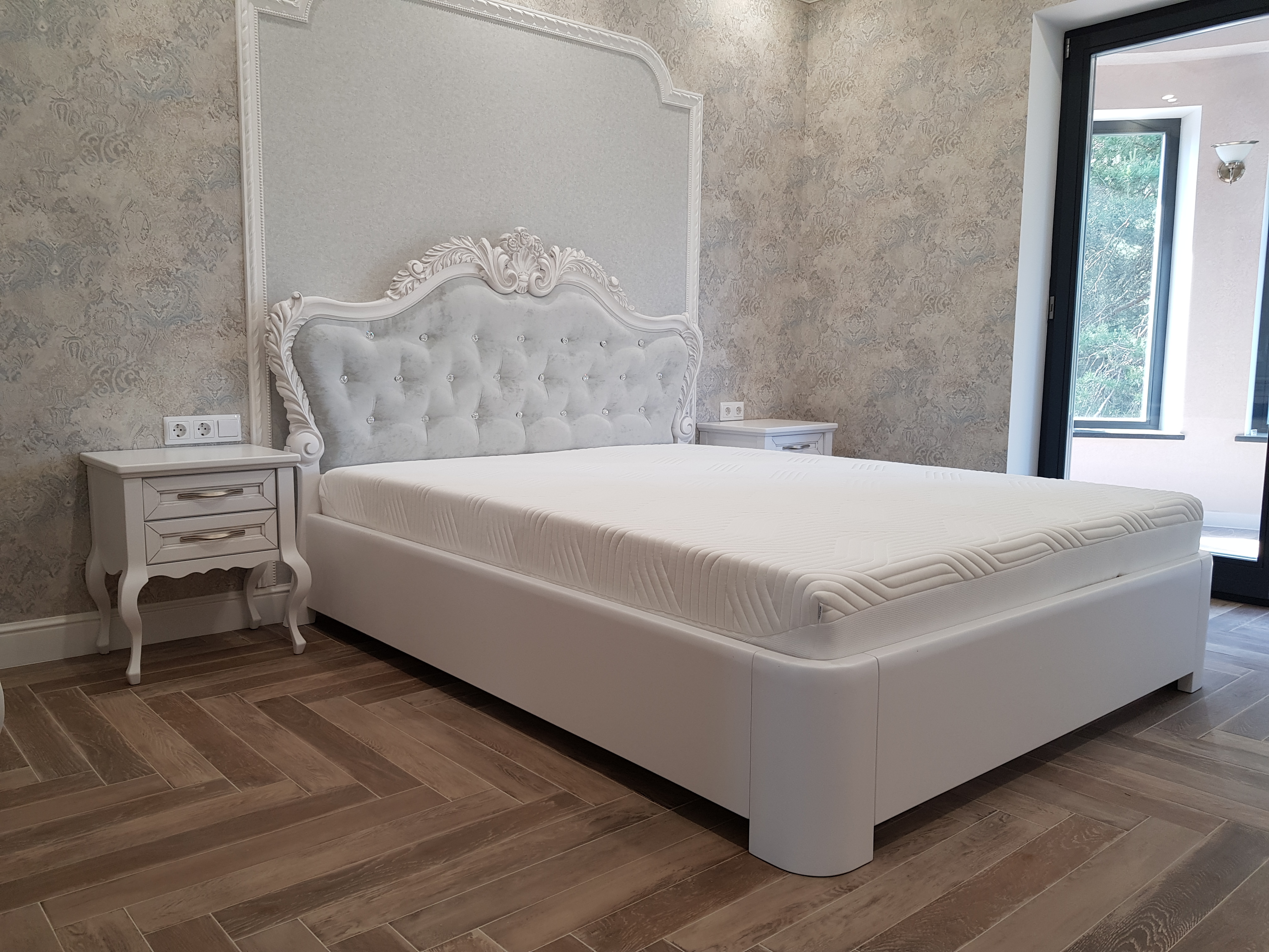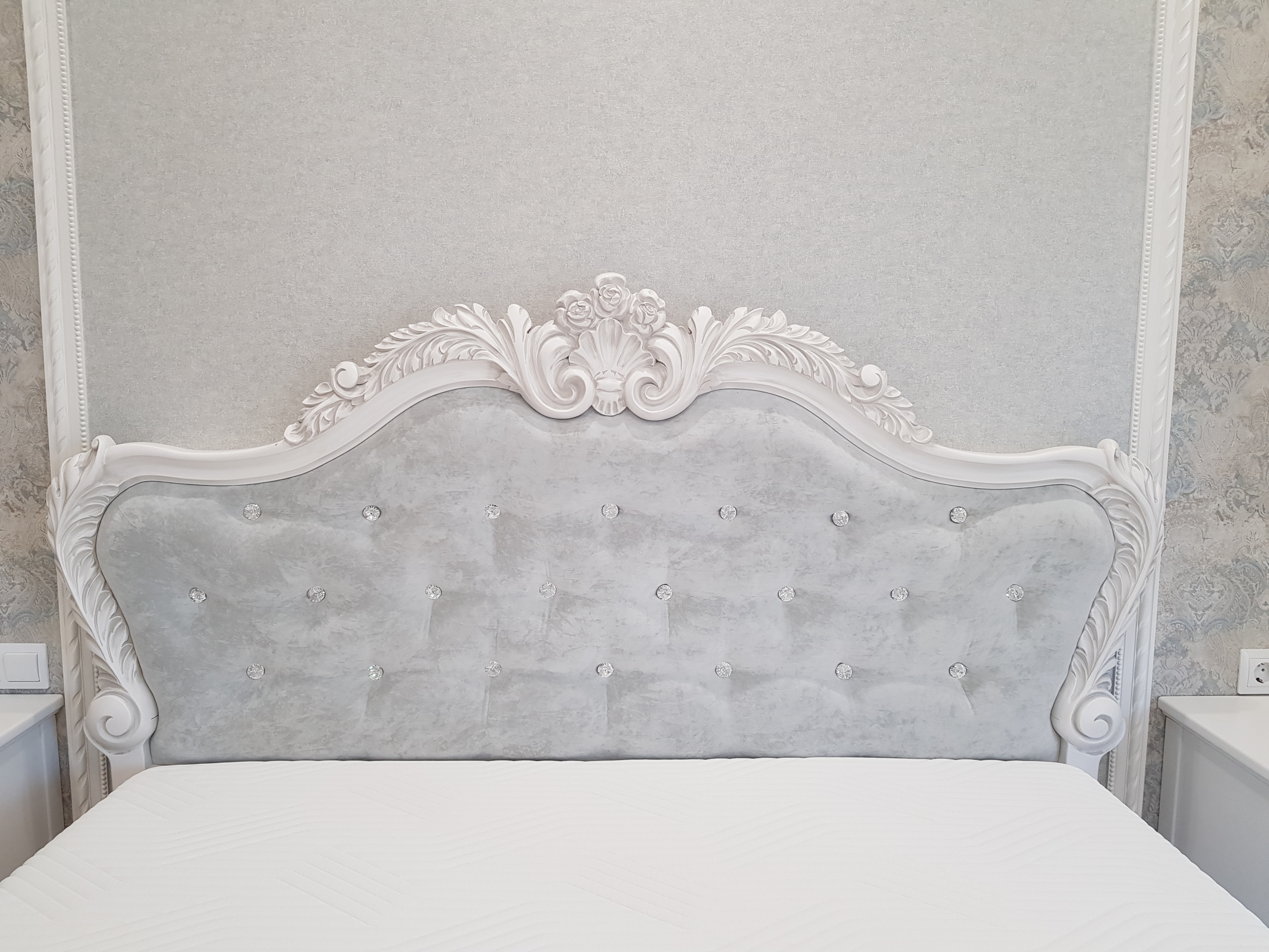 Спальня "Валери". Массив ольхи, резьба ручной работы. Кровать 160×200 спальное место с подъемным механизмом. В спинке ткань и пуговицы Swarovski. Фурнитура Blum. Цвет-эмаль с патиной. Под заказ изготовим любой вариант по цвету и размерам. Цена указана только за кровать.