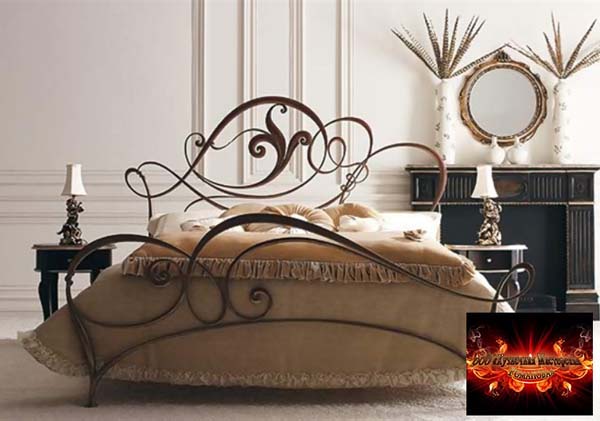 Кровать, безусловно, привлекает внимание благодаря своей кованой замысловатой конструкции. Изголовье кровати являет собой переплетение витиеватых элементов, тогда как вторая спинка кровати меньше размером и узор каркаса выполнен скромнее.