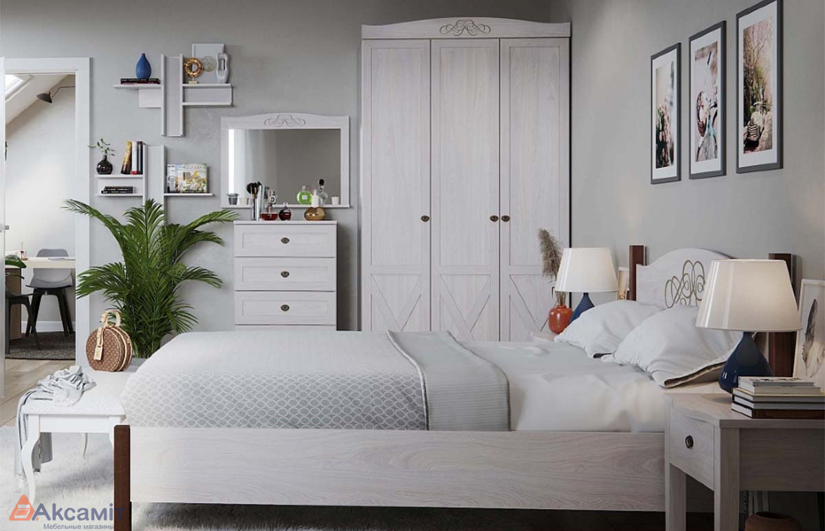 код 117602Полуторная кровать под светлый интерьер. Изголовье декорировано узорами.