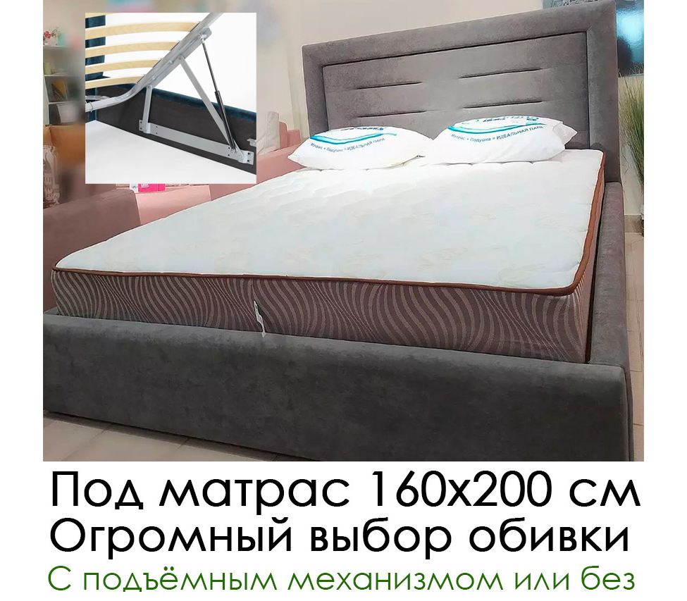 Современная кровать с мягким изголовьем и ортопедическим основанием. Спальное место на выбор, может быть с подъемным механизмом.