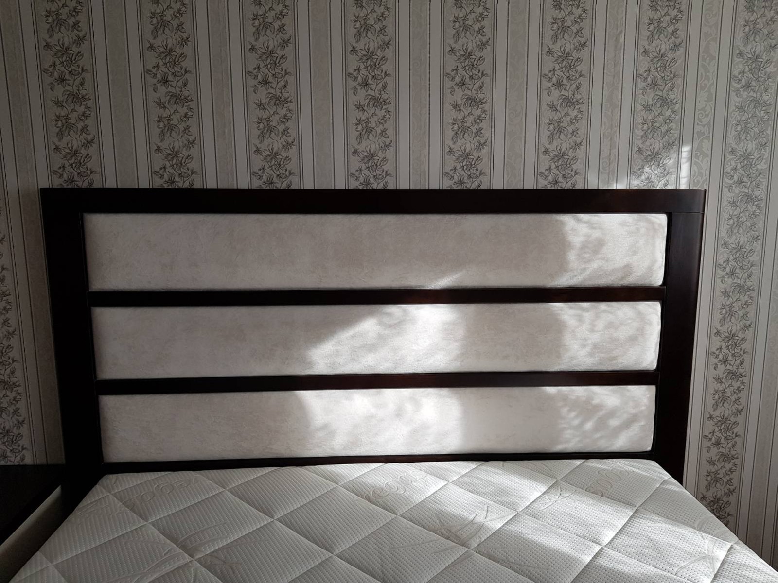 Изголовье кровати имеет широкие мягкие вставки, которые не только красивы на вид, но и защитят голову от случайных столкновений с этой частью предмета мебели. Основанием кровати служат широкие угловые ножки.