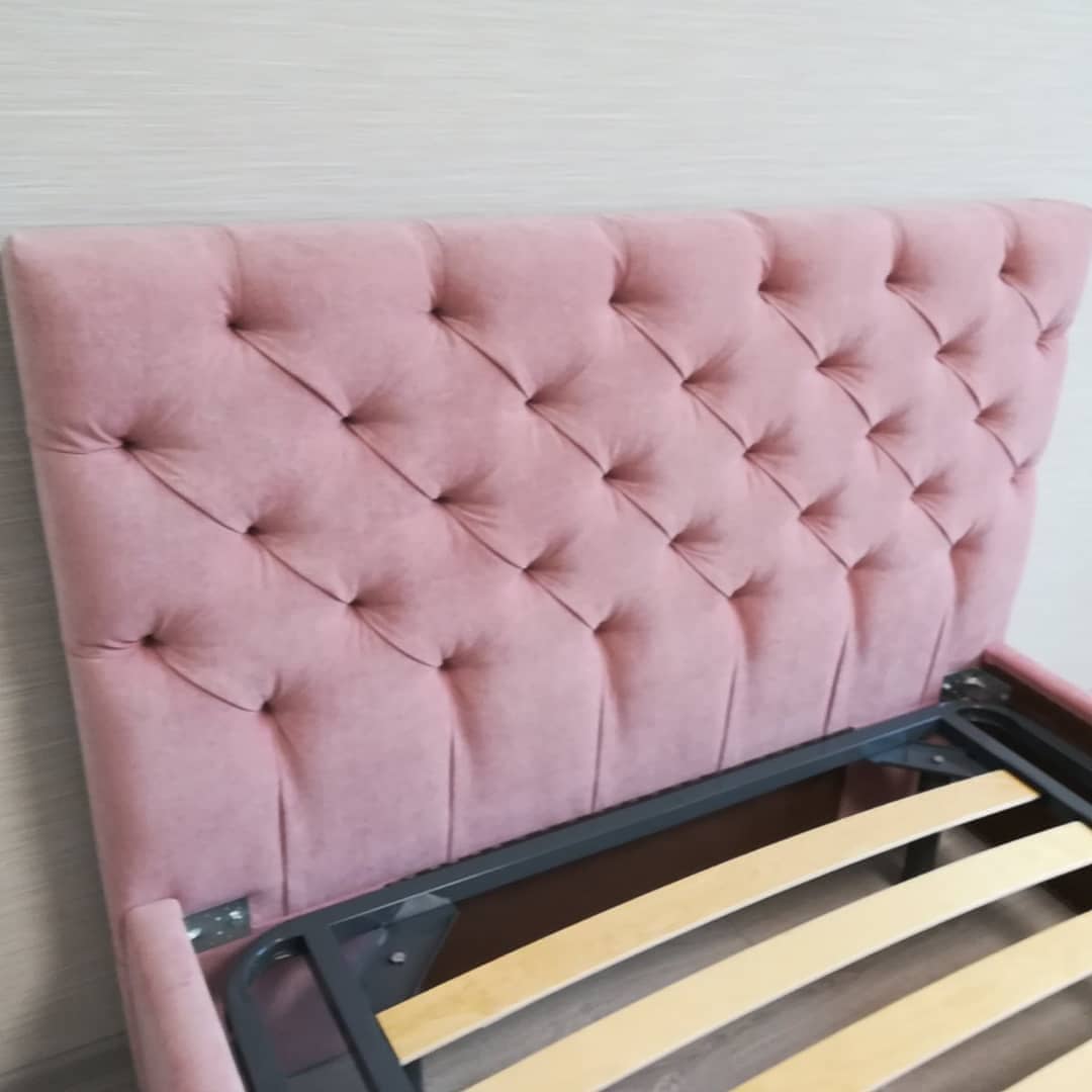 Кровать Юнис - стильная кровать с мягким изголовьем и спинкой. Ниша для белья. Большой выбор тканей.