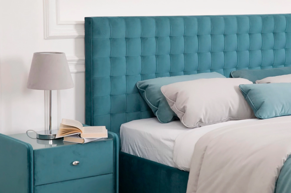 Трендовый дизайн с ровными объемными линиями на изголовье. Большой выбор тканей обивки.